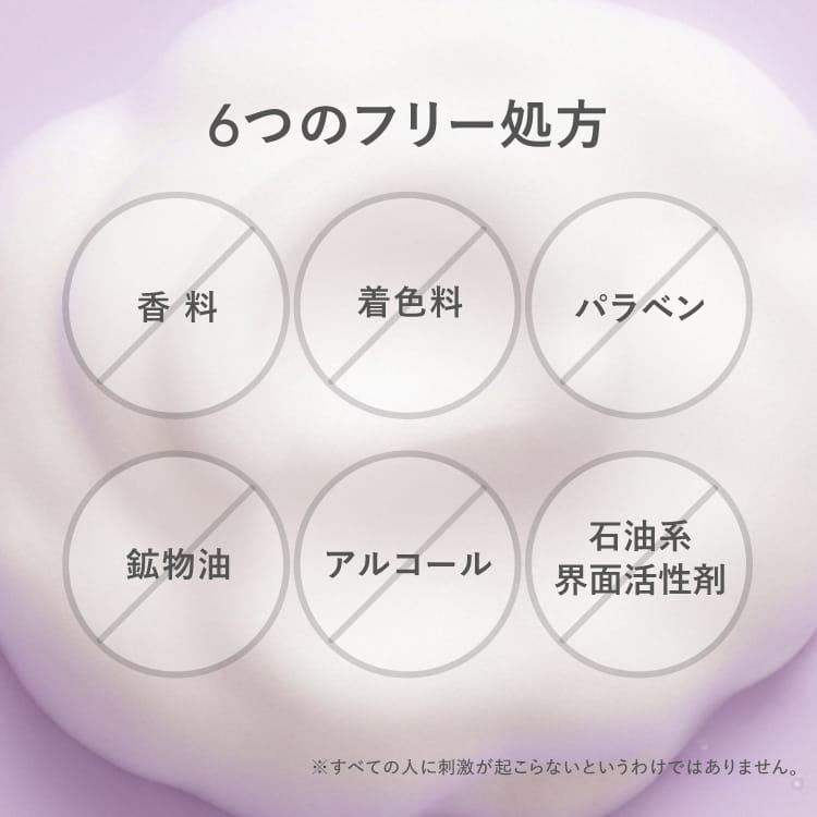 | フリー処方 | 無香料 / 無着色 / 無鉱物油 / パラベンフリー / アルコールフリー / 石油系界面活性剤フリー ※すべての人に刺激が起こらないというわけではありません。 |