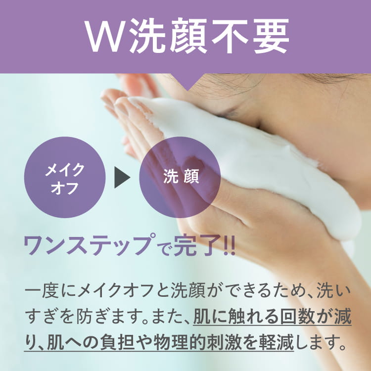 | ご使用方法 | 顔を軽くぬらしてから、適量(6〜8プッシュ)を手に取り、泡をメイクになじませるようにして、やさしく洗顔してください。 洗顔後は、水またはぬるま湯でよく洗い流してください。 メイク落としと洗顔が一度でできます。 ※ウォータープルーフタイプのポイントメイクや日焼け止めなどが落ちにくい場合は、専用のリムーバーを使用してください。 |