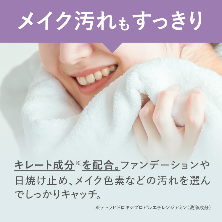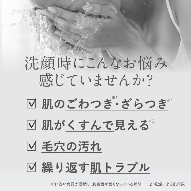 | 特徴 | 肌表面の古い角質を洗い流すピーリング成分(*1)を配合したメイクも落とせる泡タイプの洗顔料です。 溜め込んだ古い角質や角質の乱れは、肌トラブルを引き起こしたり、化粧水や美容液などの浸透(*2)を妨げます。 メイクオフと洗顔、角質ケアまでをワンステップにしたことで、肌への負担に配慮しながら、肌本来の美しさを引き出します。 5つの角質ケア成分「グリコール酸、乳酸、リンゴ酸、酒石酸、サリチル酸」を配合しました。 古い角質をやわらげ、ざらつき肌をなめらかに整えます。 特殊なポンプを採用したことで、誰でも簡単に弾力のあるきめ細かい泡を作ることができます。 モコモコの泡が手と肌の間のクッションとなり洗顔時の摩擦を軽減、擦りすぎることなくメイク汚れや毛穴の汚れを優しく洗い流します。 また、泡立て不足による肌への摩擦も最小限に抑えます。 < こんな方におすすめ > ・ツルっと洗い上げたい方 ・肌のざらつき(*3)が気になる方 ・W洗顔が面倒な方 ・洗顔時の摩擦を抑えたい方 (*1)汚れや古い角質を取り除くこと (*2)浸透は角質層まで (*3)古い角質が蓄積し、肌表面が固くなっている状態 |