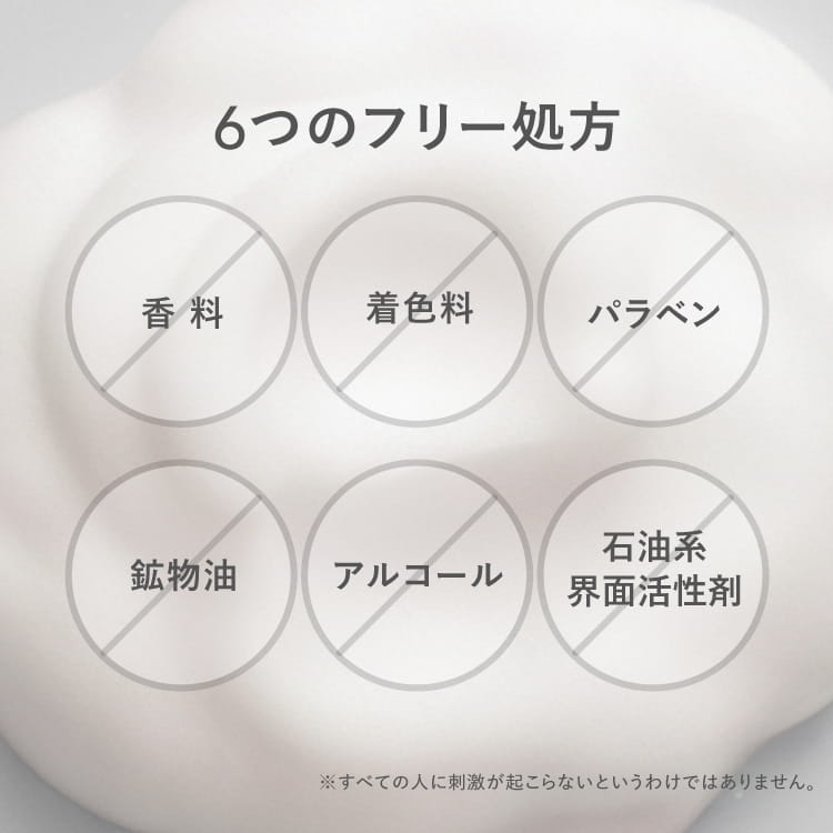 | フリー処方 | 無香料 / 無着色 / 無鉱物油 / パラベンフリー / アルコールフリー / 石油系界面活性剤フリー ※すべての人に刺激が起こらないというわけではありません。 |