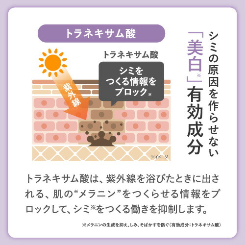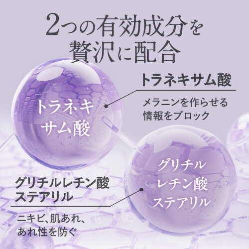 | 特徴 | 【2つの有効成分+サポート成分で美白(※1)を追求】 有効成分として、美白(※1)に導くトラネキサム酸に加えて、炎症を抑えるグリチルレチン酸ステアリルを配合。 さらにビタミンC(※2)、アルブチン(※3)、プラセンタ(※4)も配合しました。 伸びがよく、みずみずしい使用感で、デリケートな肌にもうるおい効果を発揮します。 ※レーザー治療後は、表皮化した後にお使いください。 (開放創にはお使いいただけません) 美白(※1)ケアだけでなく、乾燥による小じわのケアもできる(※5)薬用美白(※1)クリームです。 ※1:メラニンの生成を抑え、しみ、そばかすを防ぐ ※2:リン酸L-アスコルビルマグネシウム(肌を整える成分) ※3:保湿成分 ※4:プラセンタエキス(保湿成分) ※5:効能効果試験済み |